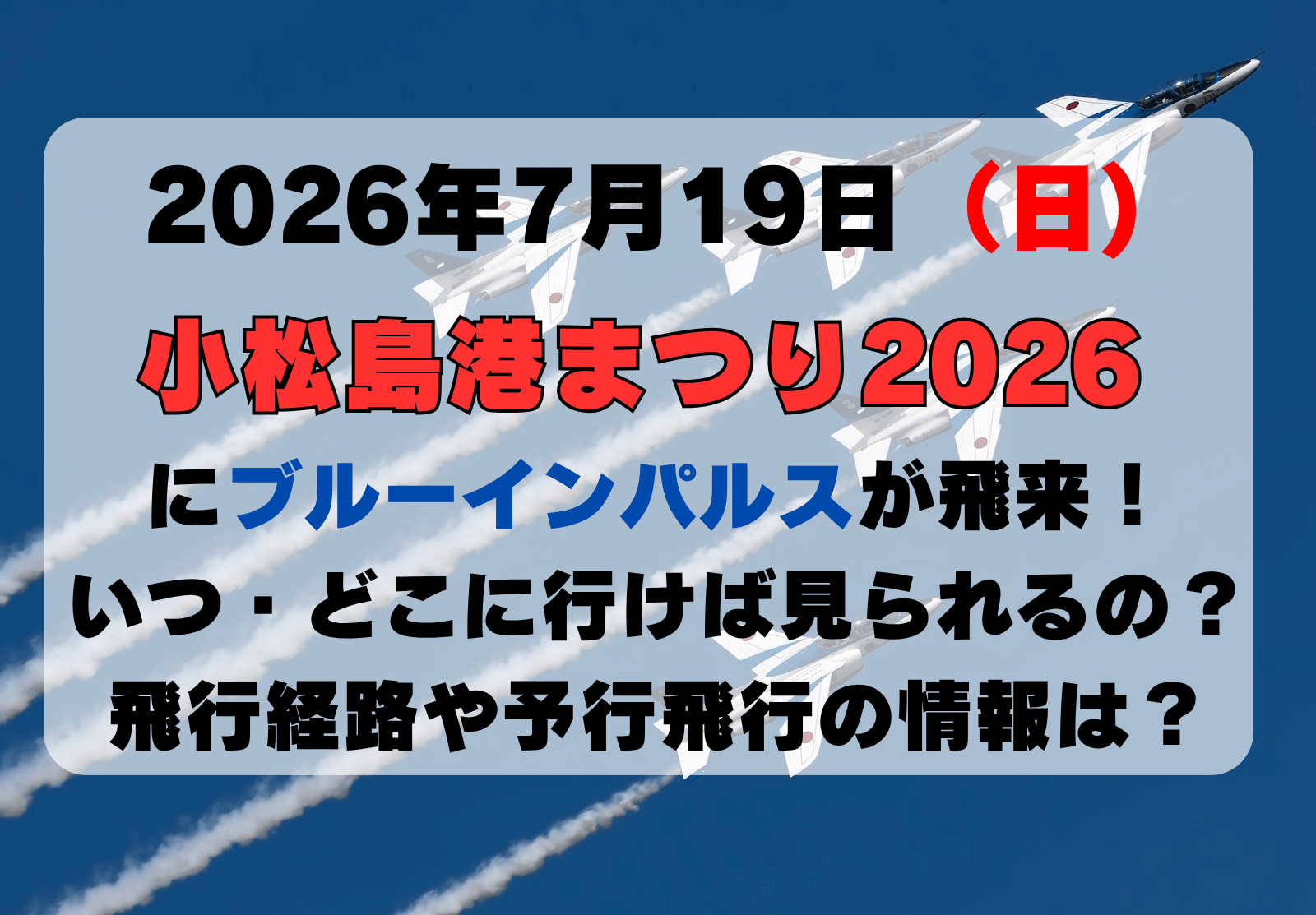 【いつどこを飛ぶの?】ブルーインパルスが小松島港まつりで飛行 2026年7月19日(日) 飛行ルートや予行飛行の有無・駐車場の情報のまとめ
