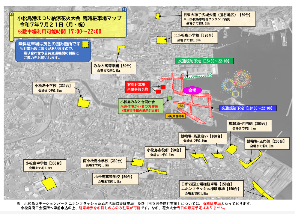 現在までのところ小松島市から駐車場や交通規制の情報は発表されていません