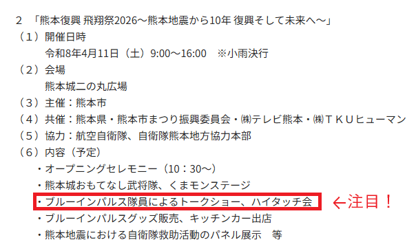 地上からブルーインパルスの飛行支援にあたるパイロットや隊員が熊本城二の丸広場に登場し、トークショーやハイタッチ会が実施されるとのことです。サイン会ではなくハイタッチ会となっているのは、限られた時間で多くの来場者と交流するための試みと見られます。いずれにしてもパイロットを近くで見ることのできるチャンスです!