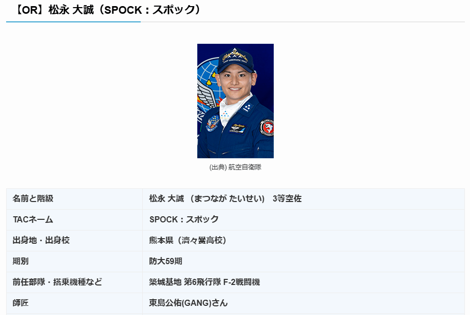 また、2番機を担当する松永 大誠3等空佐 タックネーム スポック(SPOCK)さんは熊本市出身で済々黌高校の卒業生です