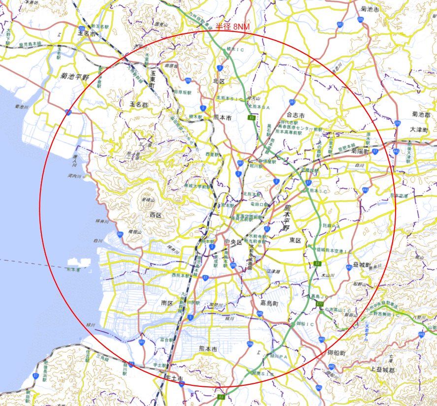 熊本城周辺エリアを中心とした半径8NM(約14,8キロ)の範囲が設定された飛行範囲ですが