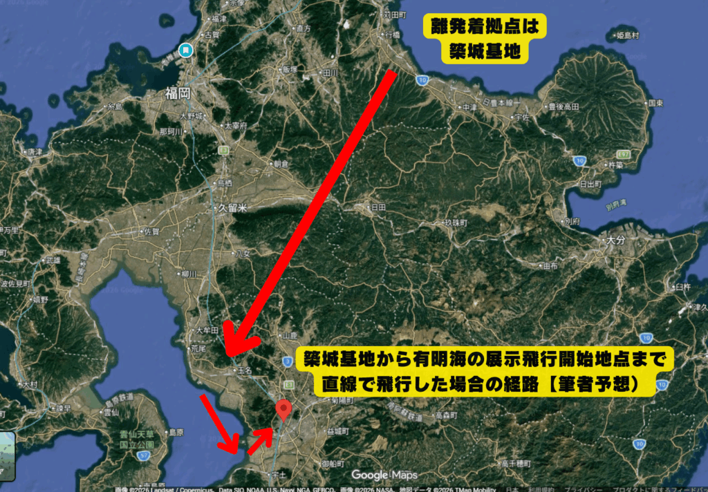 築城基地を離陸して有明海の展示飛行開始地点まで直線で飛行した場合の経路は以下のとおりとなります(筆者の予想であり実際と異なる場合があります)