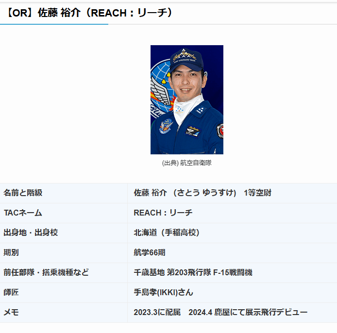 また4番機のパイロットを務める佐藤 裕介 (さとう ゆうすけ) 1等空尉、タックネームはREACH(リーチ)さんは北海道の手稲高校出身で、凱旋フライトの実施という形となります