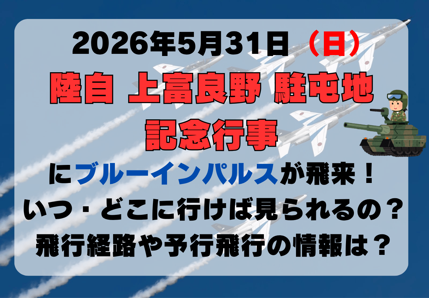 令和8年度 上富良野駐屯地記念行事におけるブルーインパルスの情報はまだ発表されていません。詳細がわかり次第記事を更新します。
