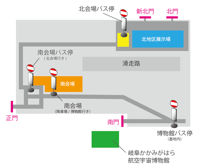 - 岐阜基地北会場 ⇔ 基地南会場(北会場と南会場間は徒歩での移動も可)