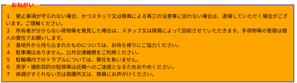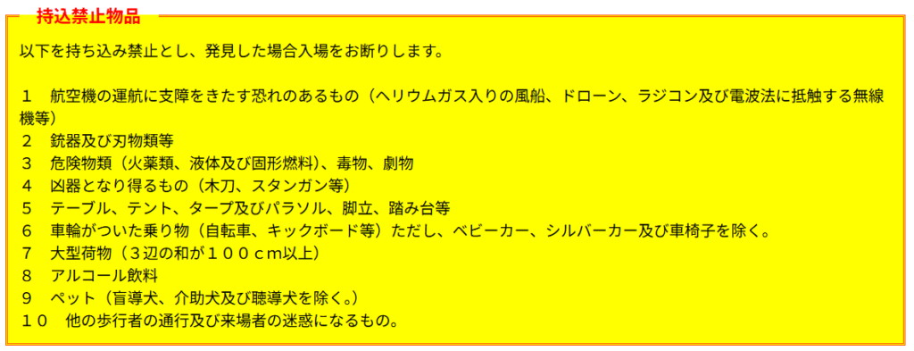 2025年の航空祭開催にあたり岐阜基地から発表された禁止事項・および持ち込み禁止物について主なものは以下のとおりです