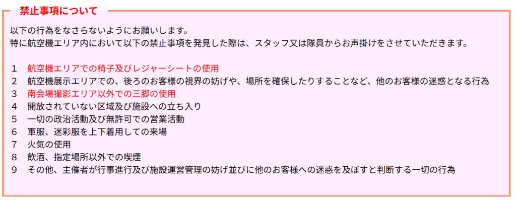 岐阜基地航空祭2025年開催にあたっての禁止事項・および持ち込み禁止物について発表されています。