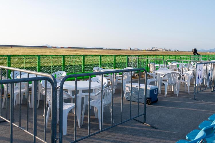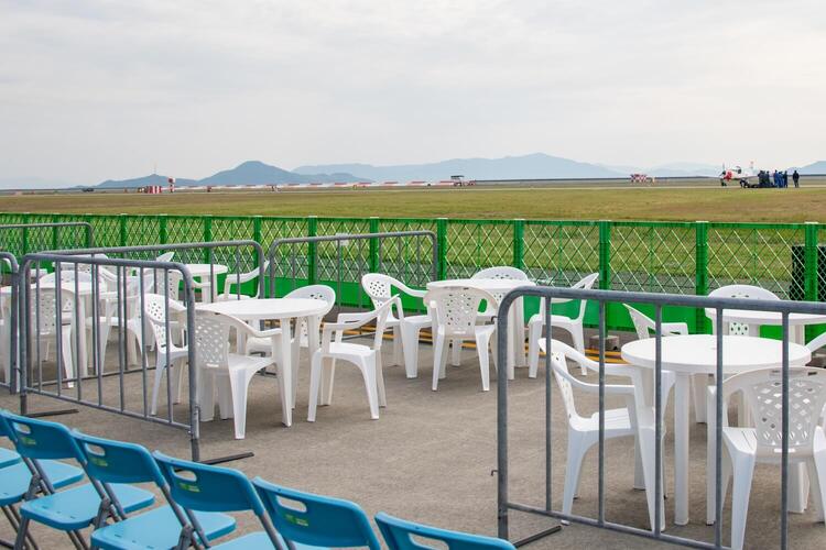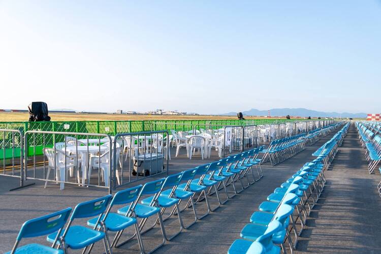 滑走路を離発着する航空機はもちろんのこと、地上走行の航空機もクリアに見る(撮影する)ことができる自由席形式です。2024年はブルーインパルスも飛来しエンジンスタートからばっちり見ることができました。