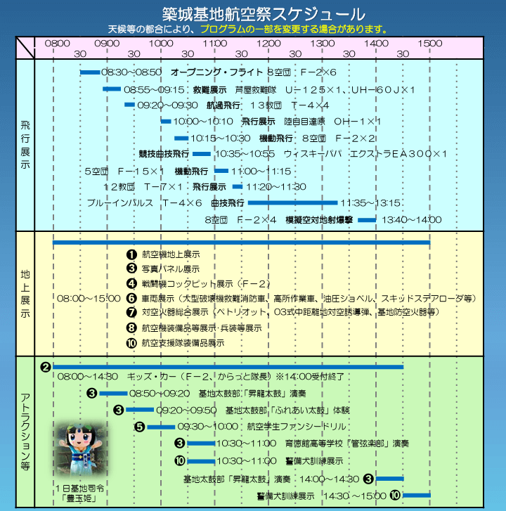 | 11:00~11:15 | F-15による機動飛行 | 新田原基地から飛来 |